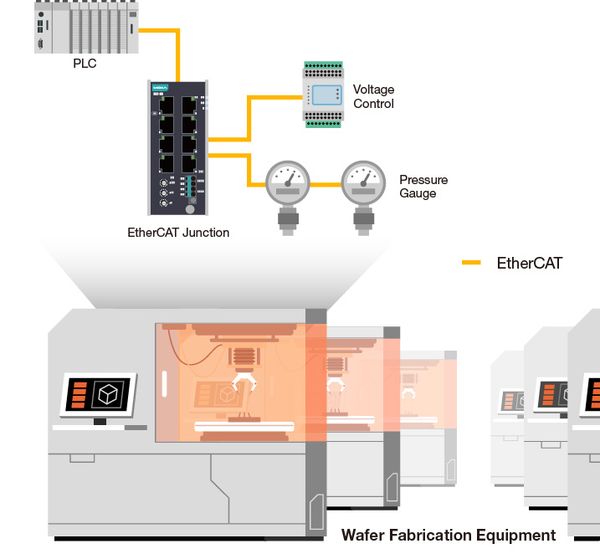 Trong sản xuất bán dẫn, giao thức EtherCAT đang trở thành công nghệ chủ đạo. Lấy thiết bị PECVD làm ví dụ, việc bổ sung thiết bị mới trong môi trường hạn chế về không gian và nhiễu thường rất khó khăn. Thiết bị cần kết nối nhiều cảm biến, đồng hồ đo áp suất và bộ điều khiển công suất. Để làm được điều đó, các nhà chế tạo máy cần các sản phẩm EtherCAT nhỏ gọn với nhiều cổng, có khả năng chống nhiễu đồng thời tính đến khả năng mở rộng trong tương lai.